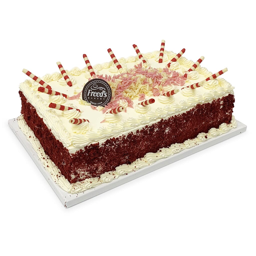 Las Vegas' favorite red velvet cake since 1959! Classic red velvet cake filled with Freed's Bakery's scratch made cream cheese icing and iced in true European buttercream, coated with red velvet cake crumbs, and topped with chocolate straws! One of Freed's Bakery of Las Vegas' most popular dessert cake flavors!